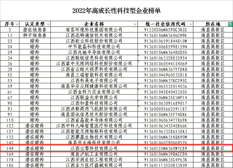 2月13日,省科技廳公布了2022年高成長性科技型企業榜單,此榜單共公布了188家高成長性企業名單,南昌企業49家, 云擎科技名列潛在瞪羚企業榜單。